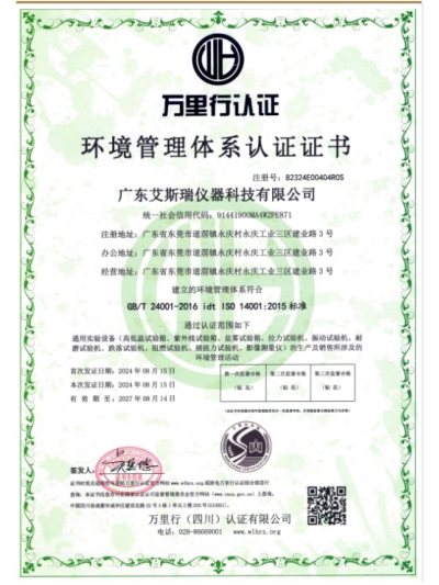 • 試驗設備的零部件來自于國內外知名品牌廠商,包括部分精密部件也是者自主研發,公司采用先進的檢測技術和嚴格質量控制系統,執行遵照ISO9001國際質量管理體系認證及ISO14001環境管理 體系認證證書和控制生產過程,確保設備高效節能